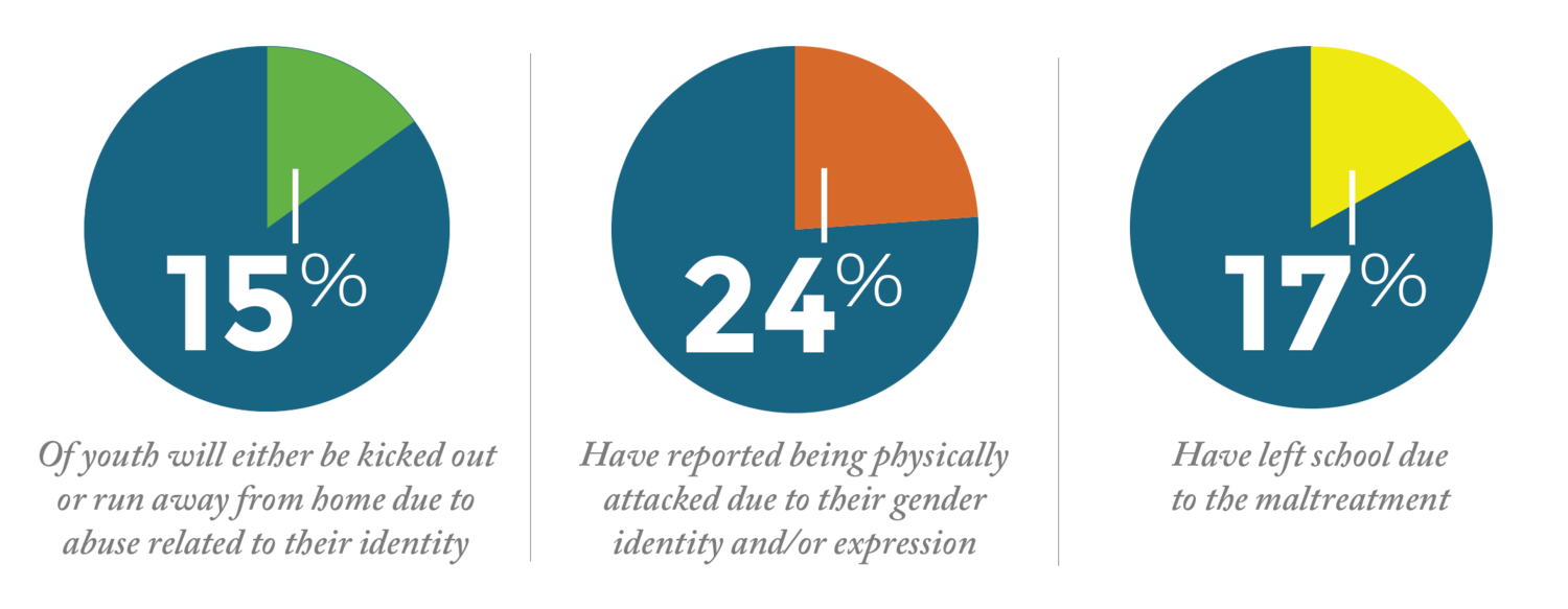This research also shows that 15% of youth will either be kicked out or run away from home due to abuse related to their identity. In school, 24% have reported being physically attacked due to their gender identity and/or expression and 17% have left school due to the maltreatment.