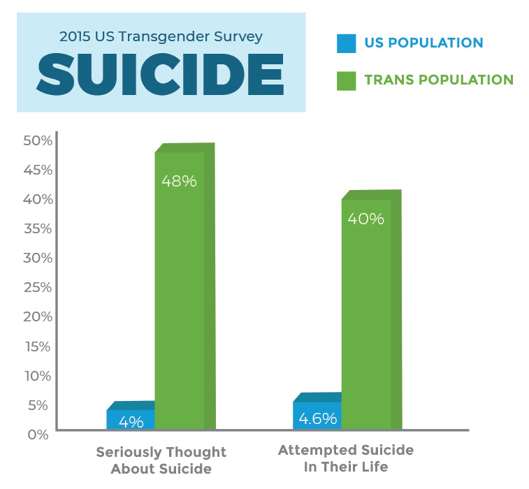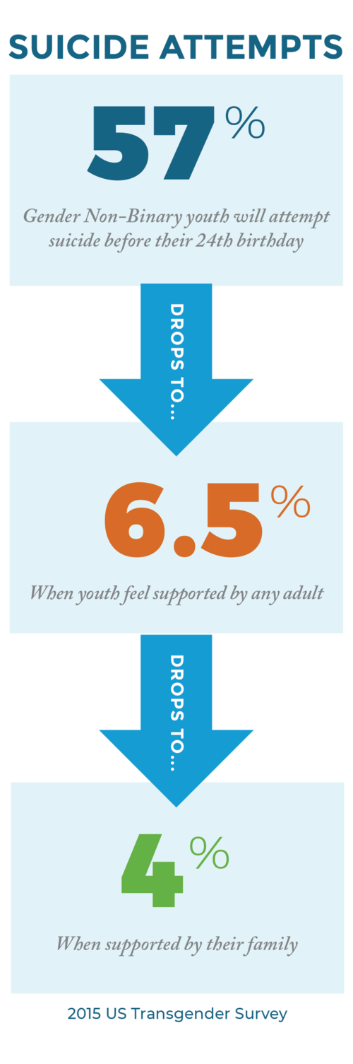57% of trans youth with unsupportive families will attempt suicide before the age of 24. With a supportive family environment, this goes down to 4%. LGBTQ youth are at a much greater risk of attempting suicide, 4-6 TIMES higher that cisgender and straight kids.